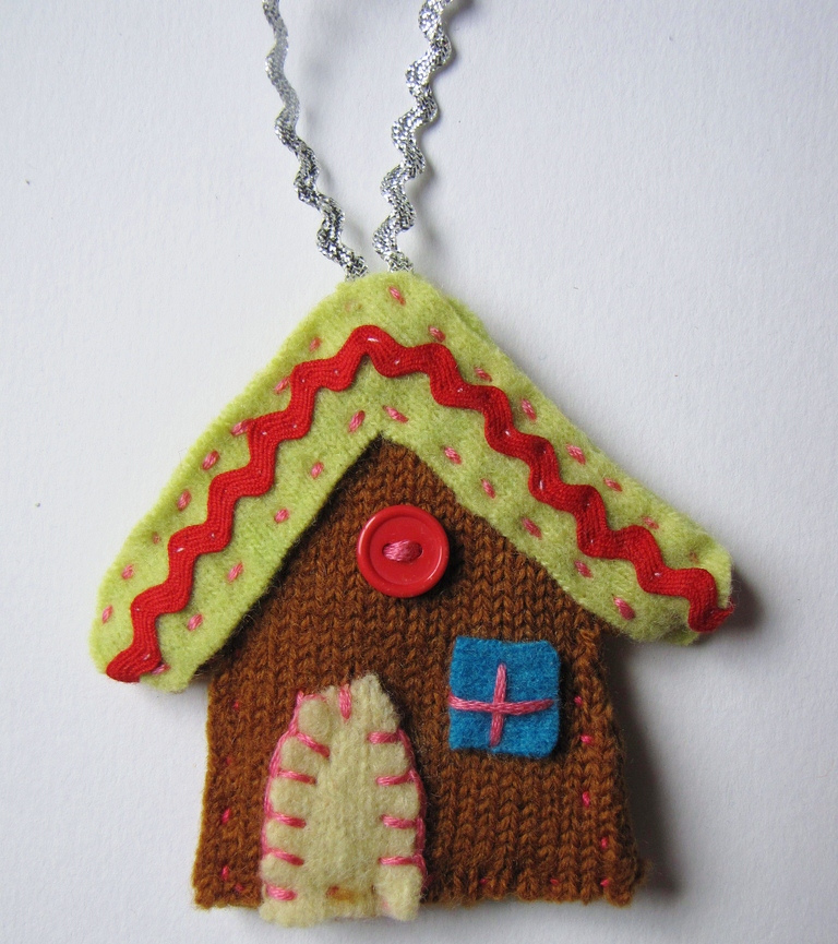 picture of the finished re-sew-cool gingerbread man and gingerbread house Christmas ornaments. They will